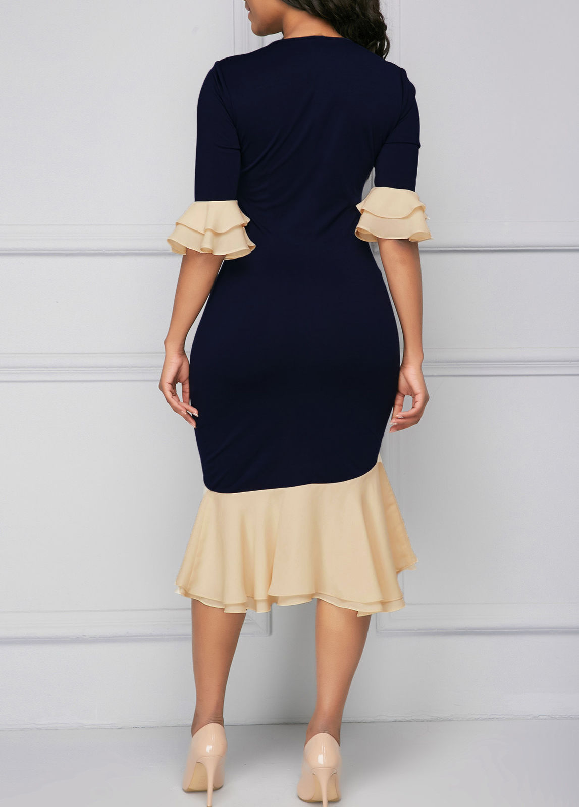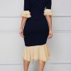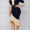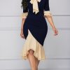 COLOR BLOCK BOW TIE RUFFLE SLEEVE ASYMMETRICAL DRESS