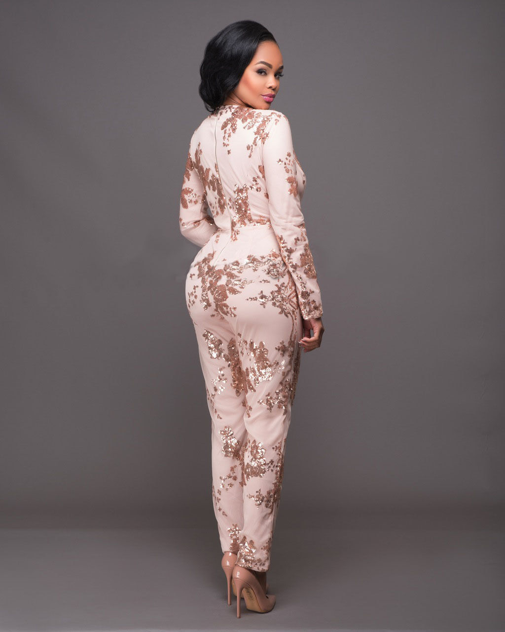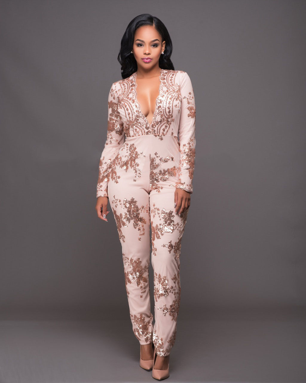 PLUNGING NECK FLORAL SEQUIN LACE JUMPSUIT
