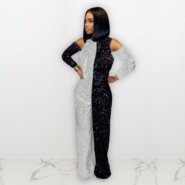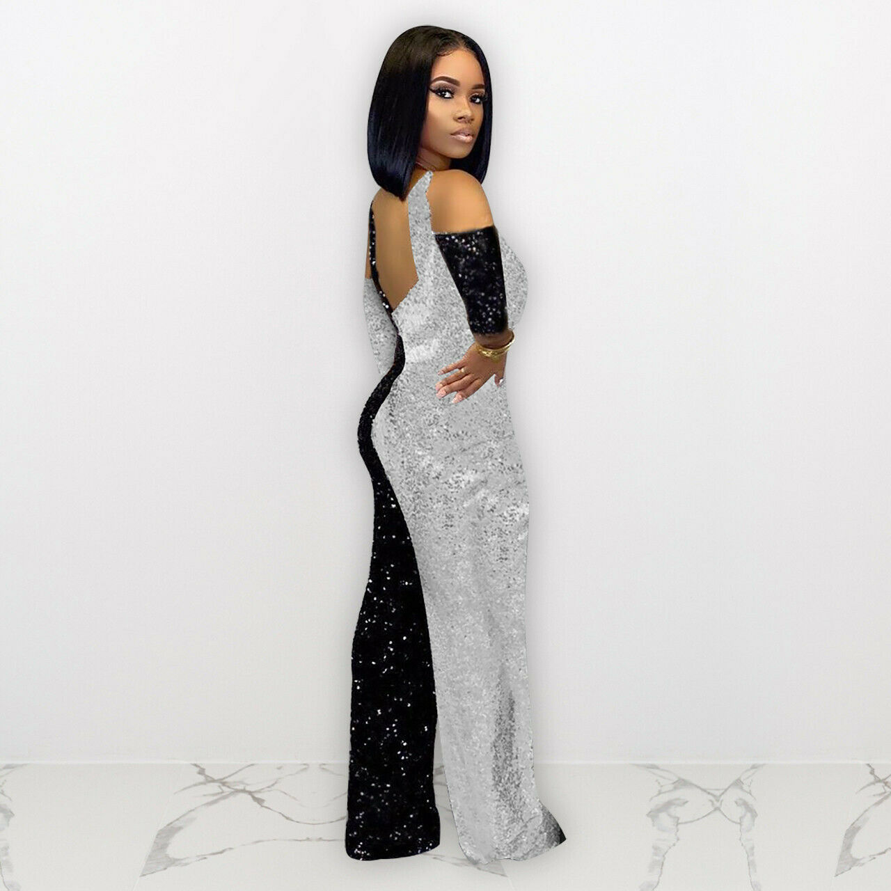 OFF SHOULDER COLOR BLOCK SEQUIN JUMPSUIT